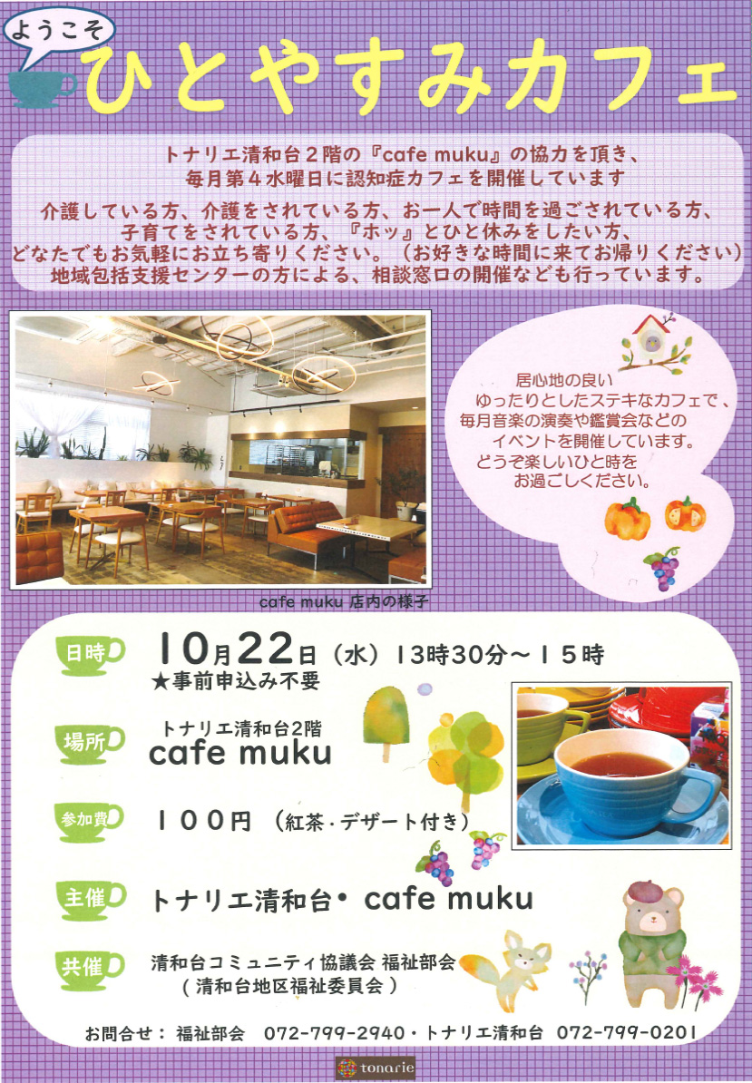トナリエ清和台2階の『cafe muku』の協力をいただき、毎月第4水曜日に認知症カフェを開催しています。