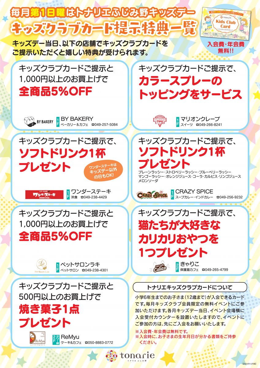 キッズデー当日は、以下の店舗でキッズクラブカードをご提示いただくと