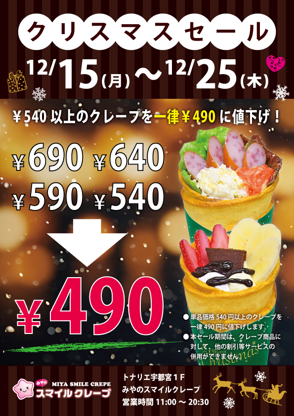 12/15(月)~12/25(金)の11日間、単品価格540円以上のクレープを一律490円に値下げして販売するクリスマスセールを開催致します。この機会にぜひ豪華な商品をお召し上がり下さいませ。期間限定商品も対象です。お持ち帰りにも対応致します。