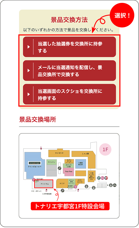 交換方法を選択し、トナリエ宇都宮1F 特設会場へお越しください。(以下のいずれかの方法で景品を交換してください。)