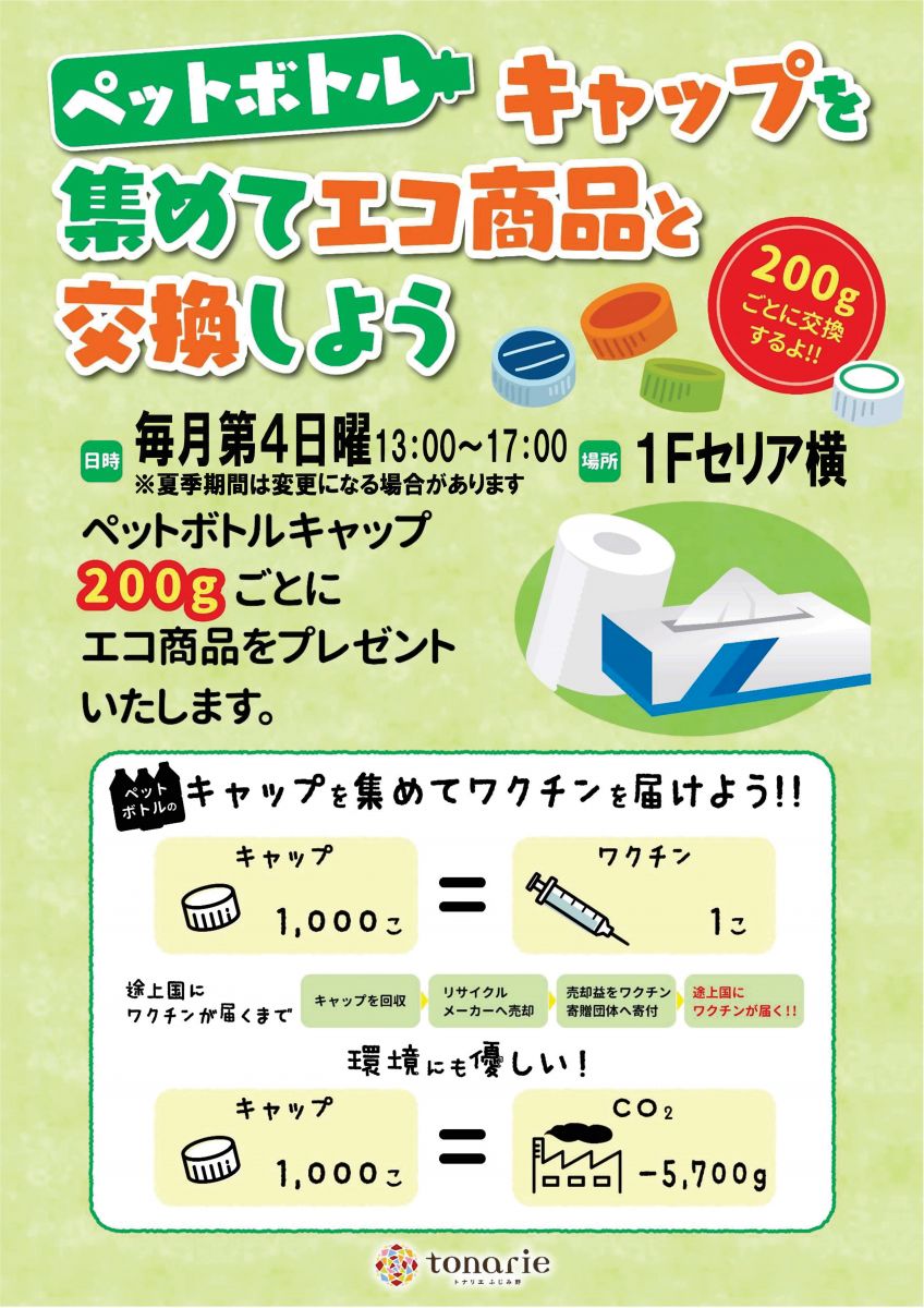 ペットボトルキャップを集めてエコ商品と交換しよう (毎月第4日曜日開催) 13:00~17:00