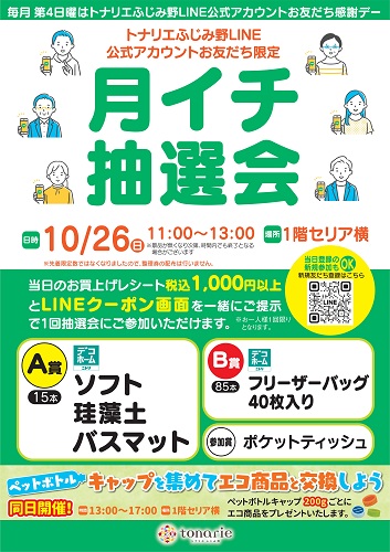 月イチ抽選会(LINE公式アカウントお友だち限定) 10/26㈰ 11:00~13:00