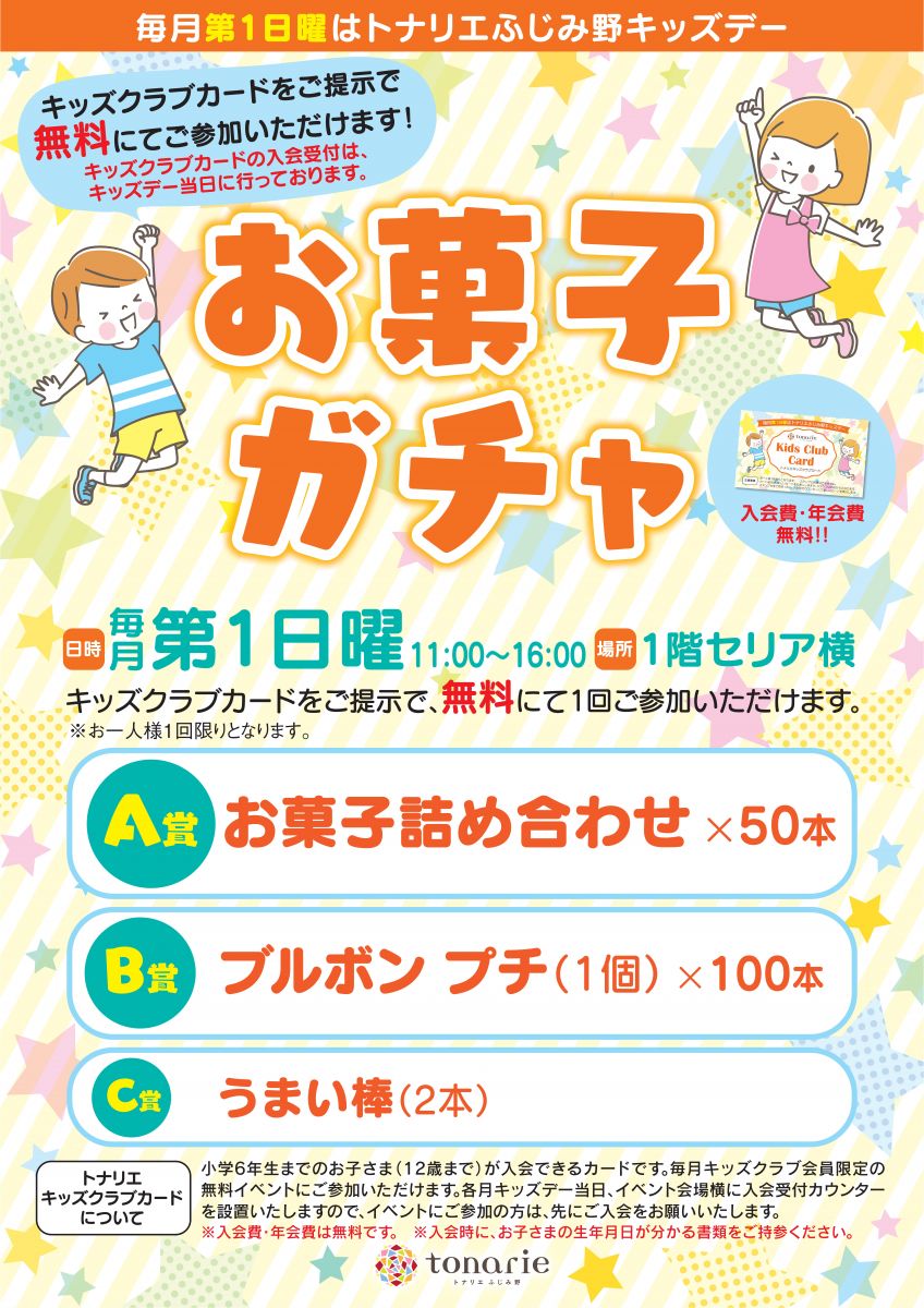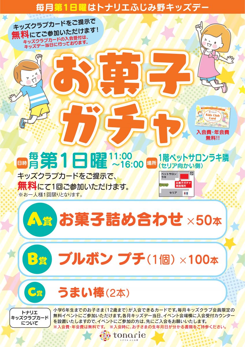 お菓子ガチャ(キッズクラブ会員さま限定)毎月第1日曜日11:00~16:00