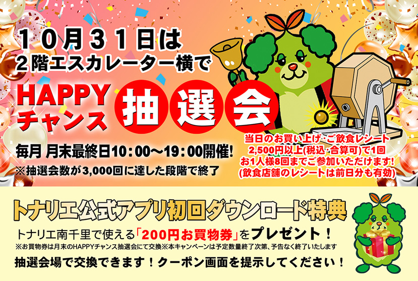 今月のHAPPYチャンス抽選会は、10月31日(金)に2階エスカレーター横にて開催いたします!