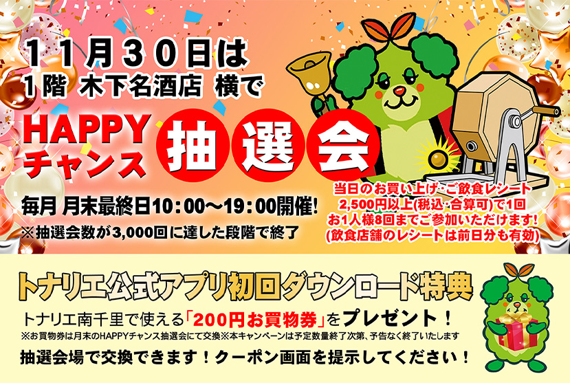 今月のHAPPYチャンス抽選会は、11月30日(日)に1階木下名酒店横にて開催いたします!