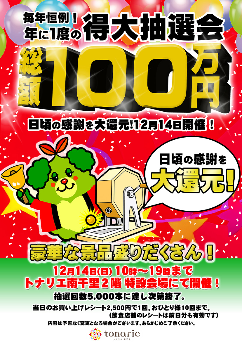 イベントEvent トナリエ南千里 TOP > イベント > 得大抽選会 イベントNEW 得大抽選会 12月14日(日)開催! 開 催 日:12月14日(日) 開催時間:10:00 ~ 19:00 ※抽選回数が5,000本に達した段階で終了 開催場所:2階 特設会場にて 参加方法:当日のお買い上げ、ご飲食レシート2,500円以上(税込・合算可)で1回ご参加いただけます。※お一人様10回まで 対象レシート:12月14日(日)のみ(飲食店舗は前日分を含みます)使用済みのレシートの再利用不可 前の記事へ 一覧へもどる 次の記事へ