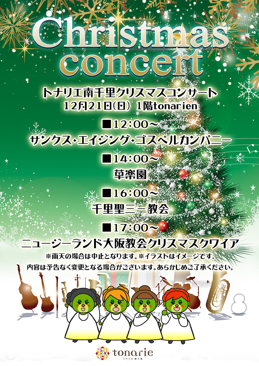 イベントNEW トナリエ南千里クリスマスコンサート 12月21日(日)トナリエキッズクリスマス撮影会と同じ日に、1階tonarienにてクリスマスコンサートを開催いたします。 寒い冬に、心暖まる演奏をぜひお楽しみください♪♪