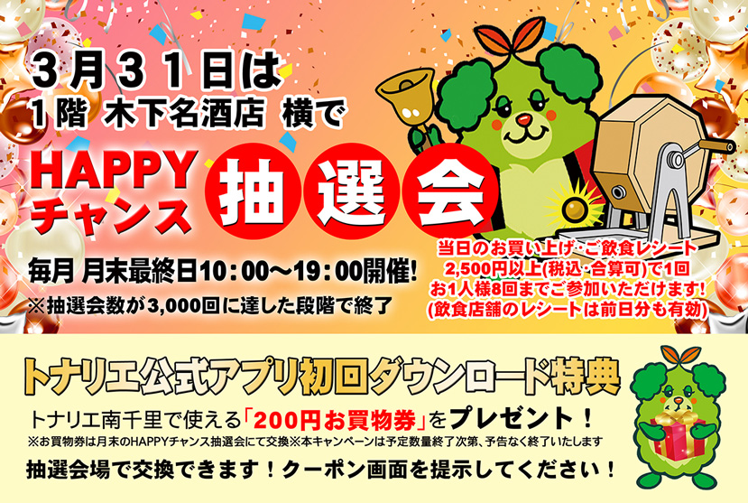 今月のHAPPYチャンス抽選会は、3月31日(火)に1階 木下名酒店横にて開催いたします!