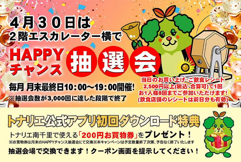 今月のHAPPYチャンス抽選会は、4月30日(木)に2階 エスカレーター横にて開催いたします!