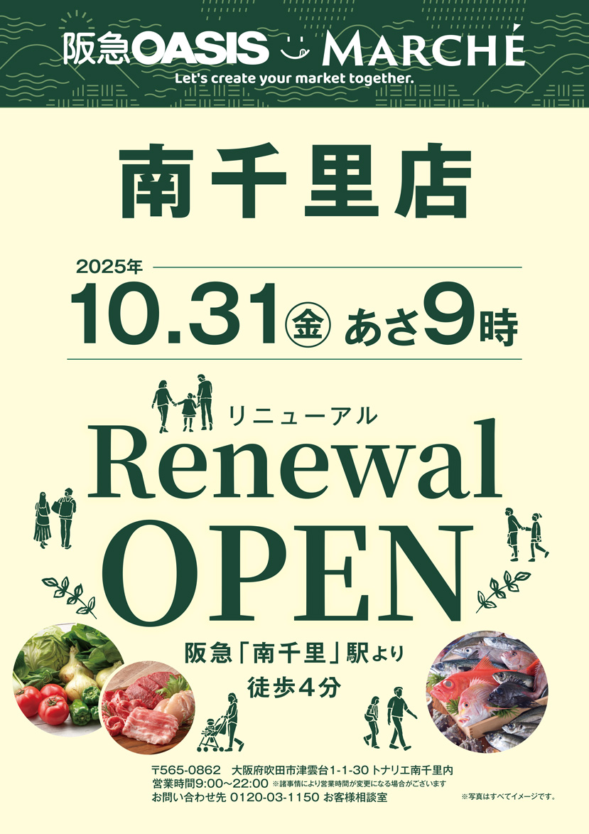 ニュースNEW 【阪急オアシス南千里店】10月31日(金)あさ9時リニューアルオープン! 阪急オアシス南千里店は阪急オアシスマルシェ南千里店に生まれ変わりました。 新しくなった売場、充実の商品ラインナップで皆様をお待ちいたします。