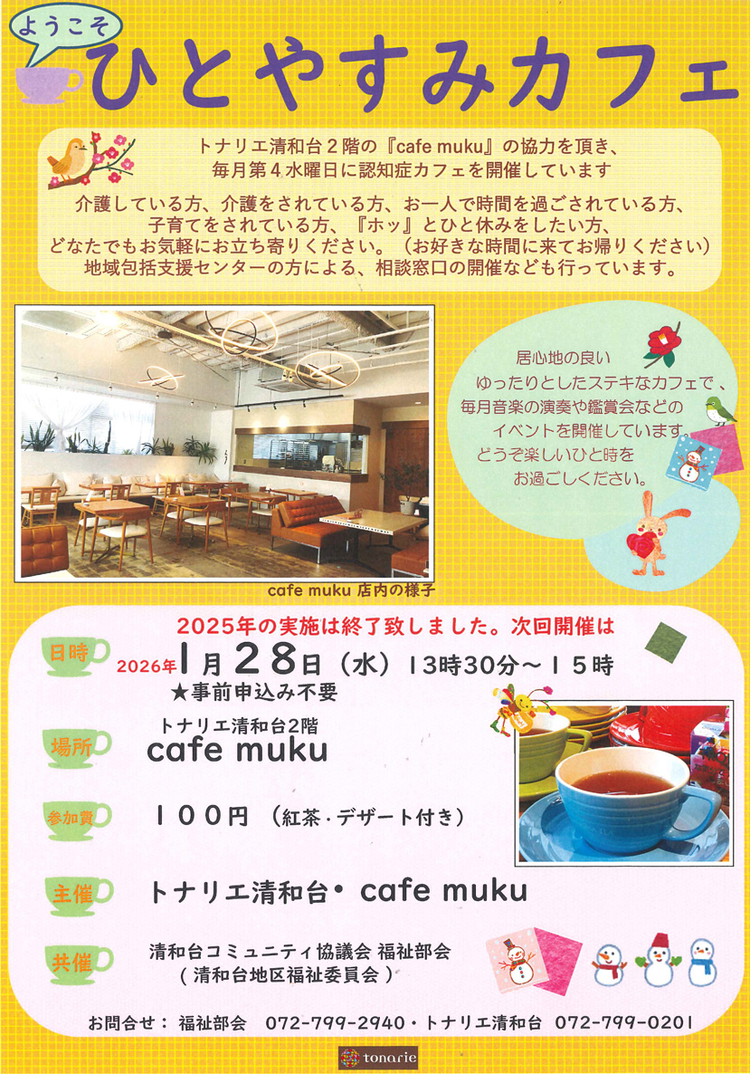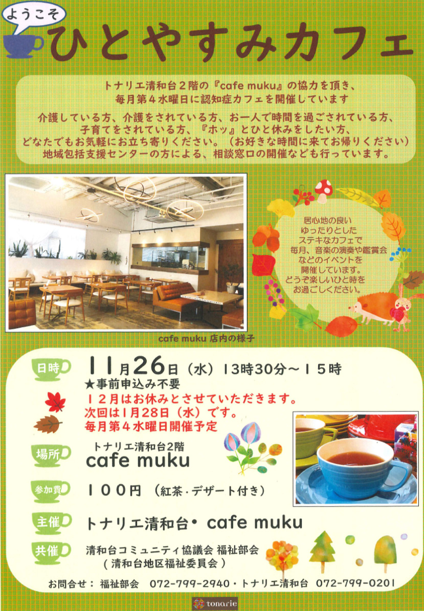 トナリエ清和台2階の『cafe muku』の協力をいただき、毎月第4水曜日に認知症カフェを開催しています。