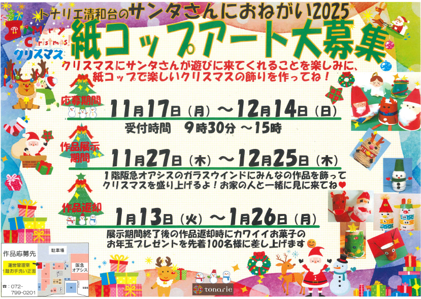 イベントEvent トナリエ清和台 TOP > イベント > サンタさんにおねがい クリスマス紙コップアート大募集! イベントNEW サンタさんにおねがい クリスマス紙コップアート大募集! 前の記事へ 一覧へもどる 次の記事へ