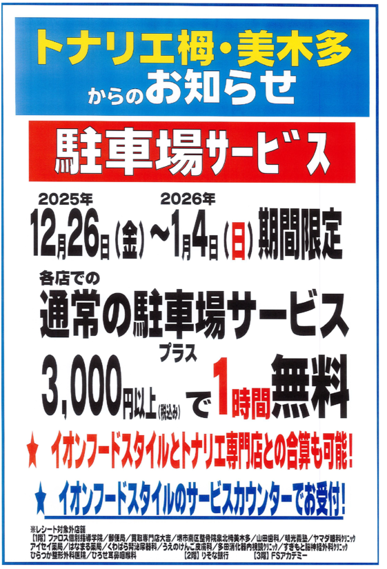 年末年始もtonarieへ。お買物・ご飲食に駐車場サービスを是非ご利用ください!!
