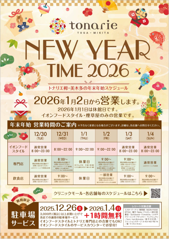イベントEvent トナリエ栂・美木多 TOP > イベント > <トナリエ栂・美木多>年末年始スケジュール2025年12月30日(火)~2026年1月4日(日) イベント <トナリエ栂・美木多>年末年始スケジュール2025年12月30日(火)~2026年1月4日(日) 前の記事へ一覧へもどる次の記事へ