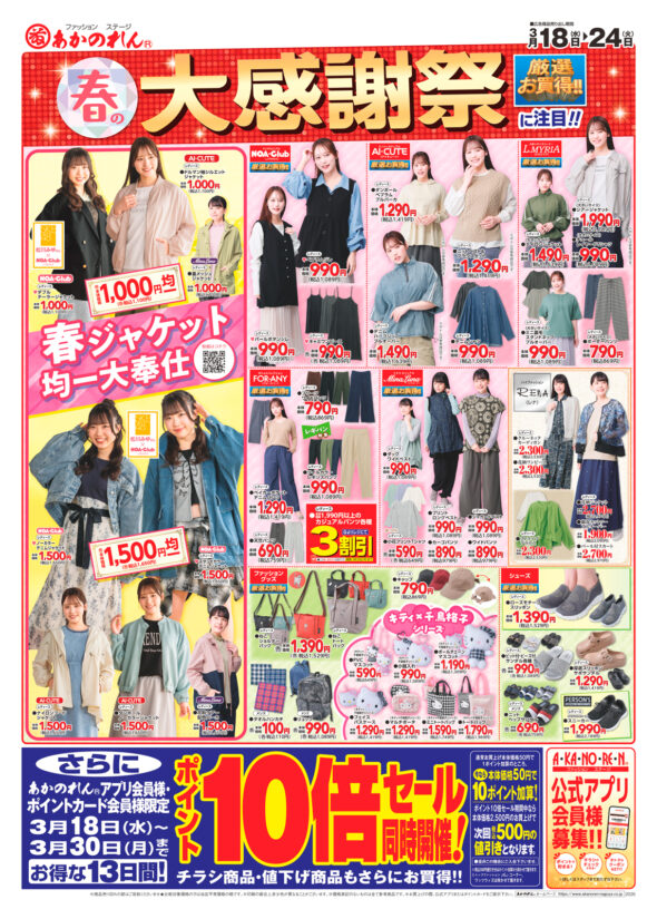 ニュース&トピックスNews & topics トナリエ栂・美木多 TOP > ニュース&トピックス > <あかのれん>春の大感謝祭3月18日(水)~24日(月) ニュース <あかのれん>春の大感謝祭3月18日(水)~24日(月) 前の記事へ一覧へもどる次の記事へ