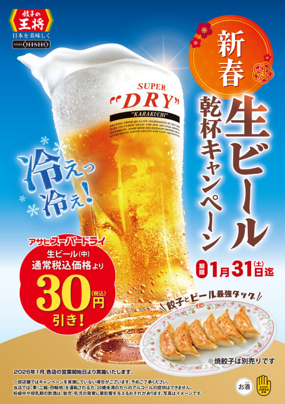 ニュース&トピックスNews & topics トナリエ栂・美木多 TOP > ニュース&トピックス > <餃子の王将>新春生ビール乾杯キャンペーン🍻1月1日(木)~31日(土) ニュース <餃子の王将>新春生ビール乾杯キャンペーン🍻1月1日(木)~31日(土) 前の記事へ一覧へもどる次の記事へ