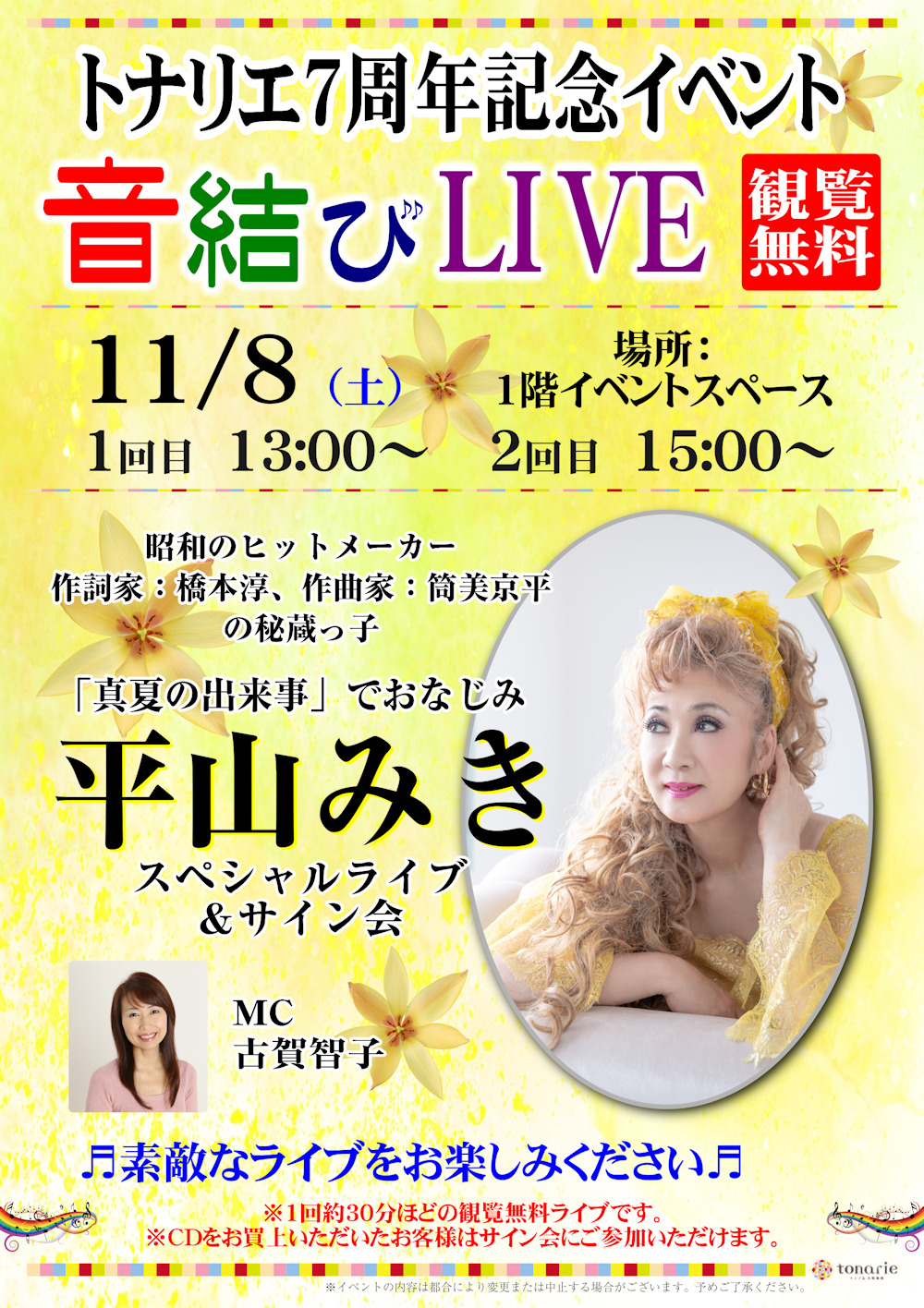 イベント 11月8日(土) 「平山みき」スペシャルライブ&サイン会トナリエ7周年記念イベント 音結び Live Special 観覧無料 ♬素敵な音楽ライブをお楽しみください♬ 11月8日(土) 場所:1階イベントスペース 1回目 13:00~ 2回目 15:00~ 出演:「真夏の出来事」でおなじみ 「平山みき」 スペシャルライブ&サイン会 MC:古賀智子 ※CDをお買上いただいたお客様はサイン会にご参加いただけます。 前の記事へ一覧へもどる次の記事へ