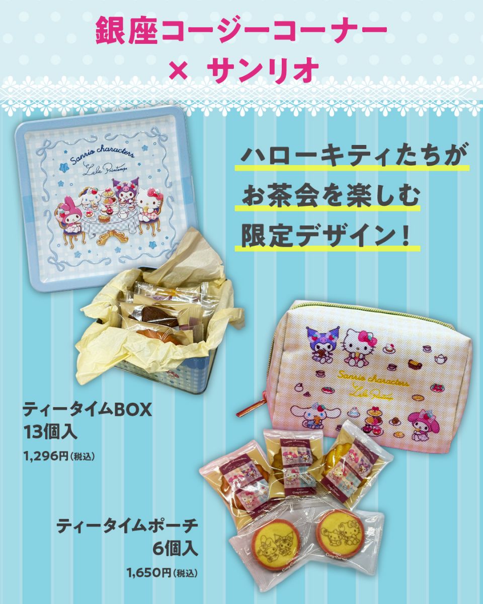 マドレーヌとクッキーの詰め合わせ。サンリオキャラクターがぷっくり立体的にあしらわれた、かわいい缶入り。食べ終わったあとも小物入れとして楽しめます。